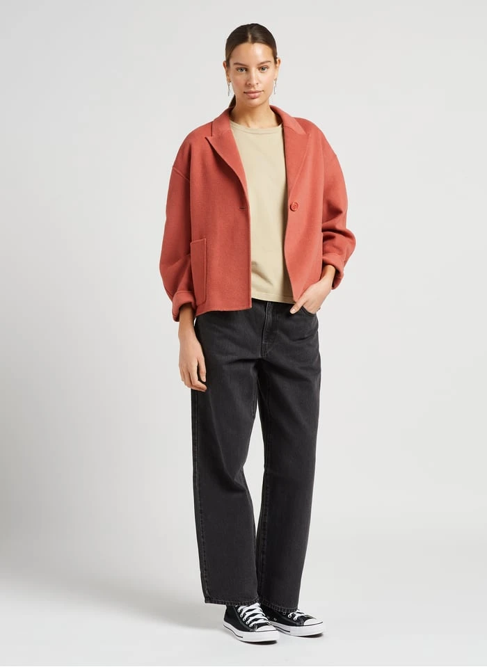 This model is shown wearing Straight-leg cotton pants by LEVI’S, Short wool-blend coat by AMERICAN VINTAGE, Converse high-top canvas sneakers by CONVERSE