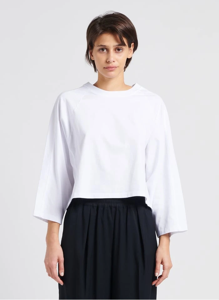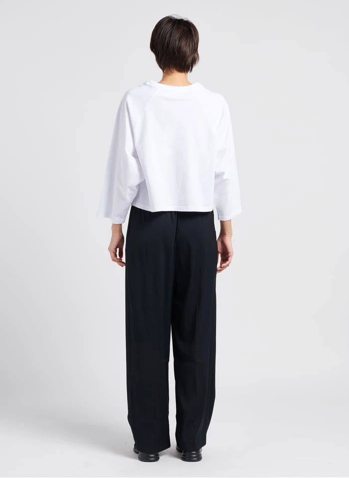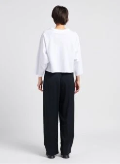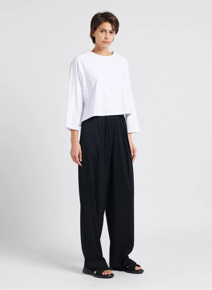This model is shown wearing High-waisted wide-leg pants by SAMSOE SAMSOE, Open wedge mules by CAMPER