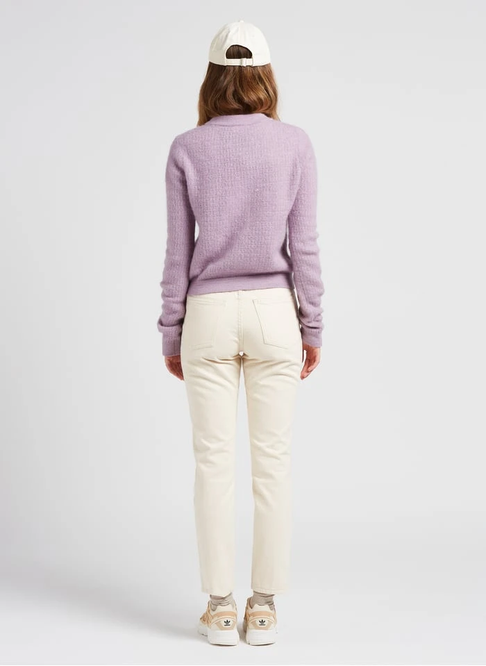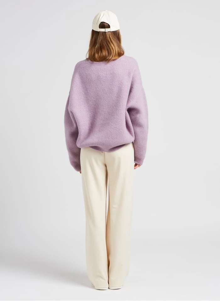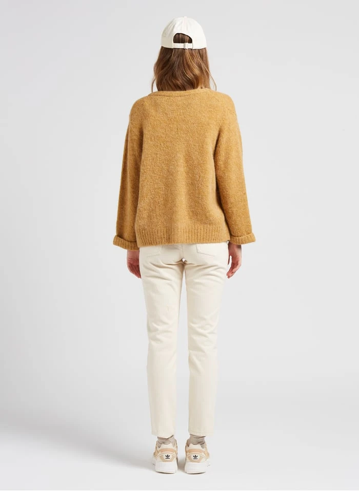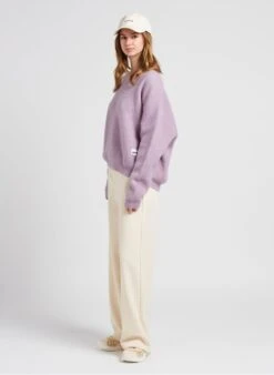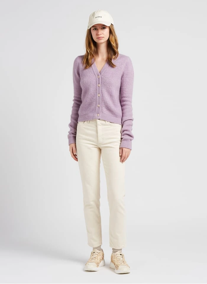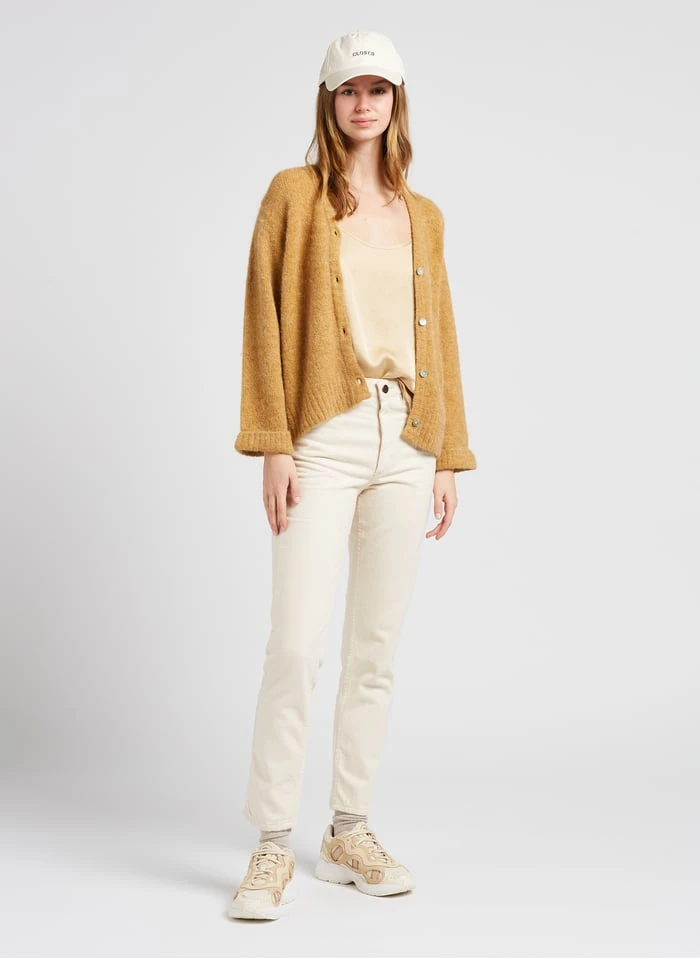 This model is shown wearing Loose-fit V-neck cardigan by AMERICAN VINTAGE, ASTIR SN W by ADIDAS