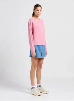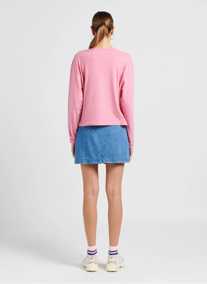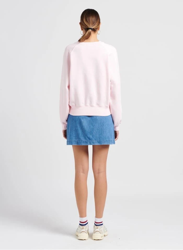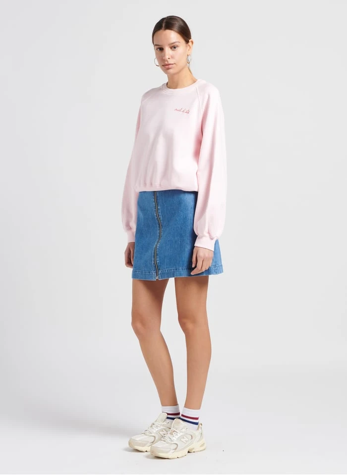 This model is shown wearing Organic cotton sweatshirt with round neck and Nuit dété embroidery by MAISON LABICHE