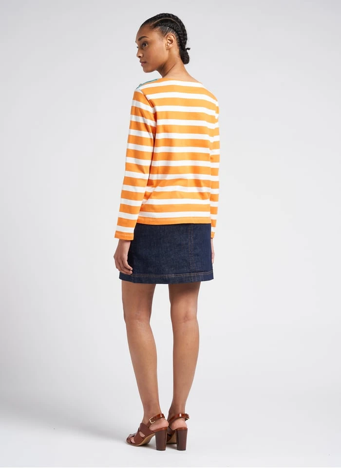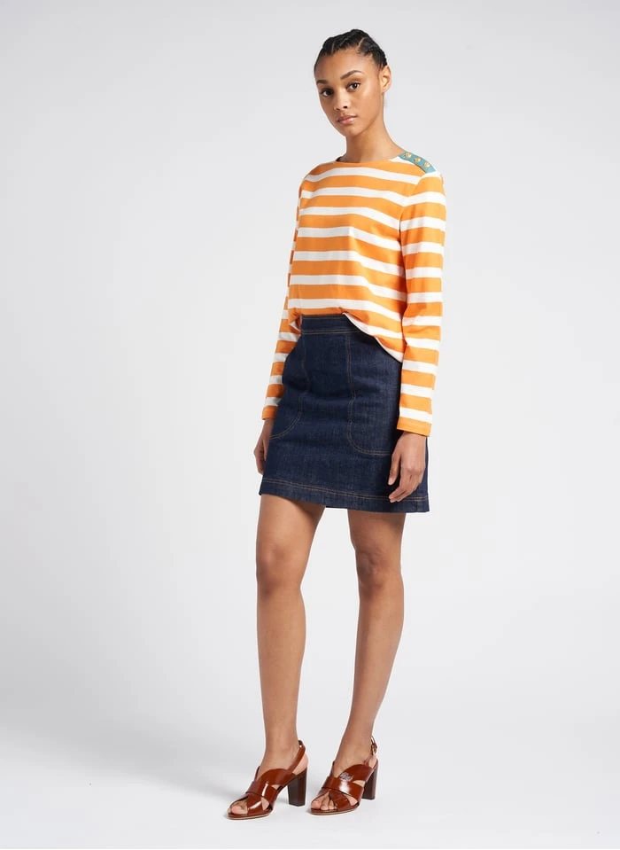 This model is shown wearing Short stretch cotton denim skirt by BENSIMON