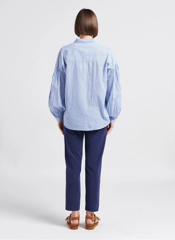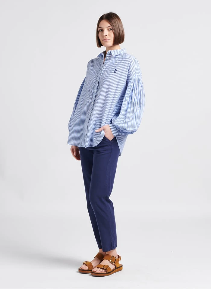This model is shown wearing Striped cotton shirt with classic collar by BERENICE, Sandales plates en cuir by ANTHOLOGY PARIS