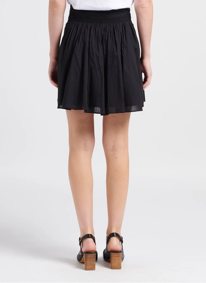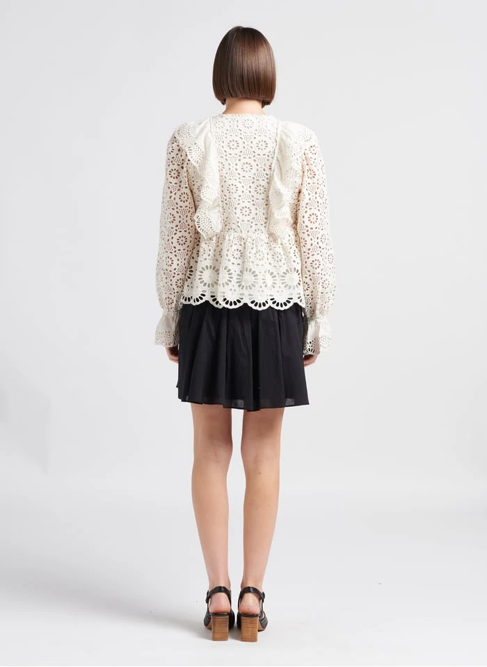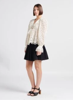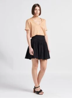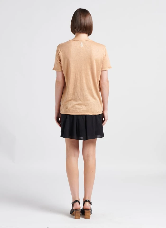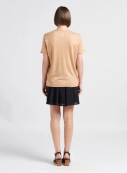 This model is shown wearing Straight-cut V-neck linen T-shirt by BERENICE, High leather sandals by ANTHOLOGY PARIS