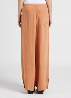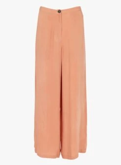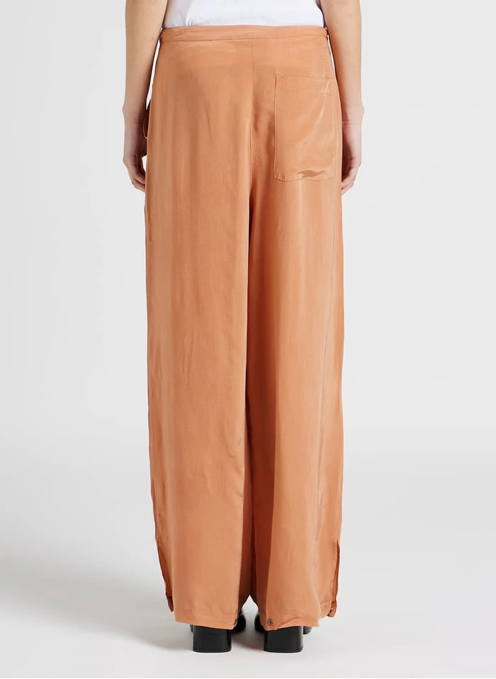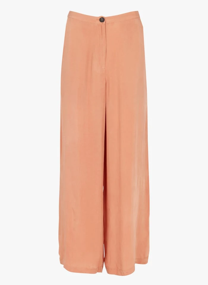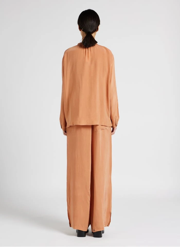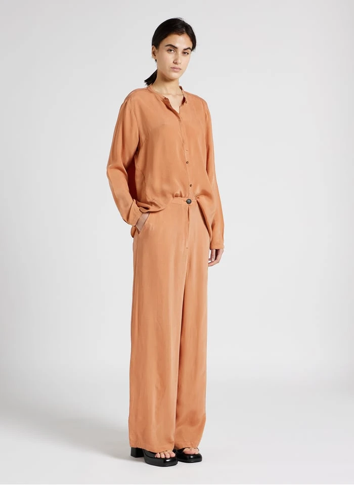 This model is shown wearing Aged leather platform mules by JONAK, Straight-cut henley blouse by HUMANOID