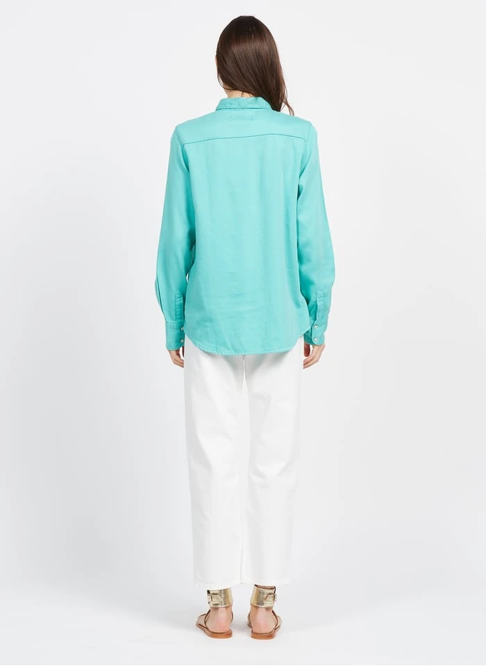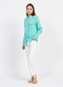 This model is shown wearing Denim shirt with classic collar by ACQUAVERDE