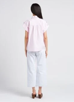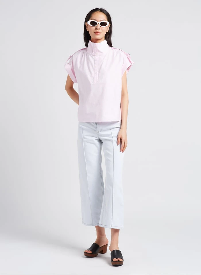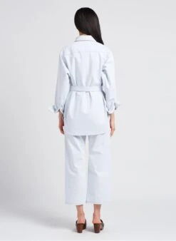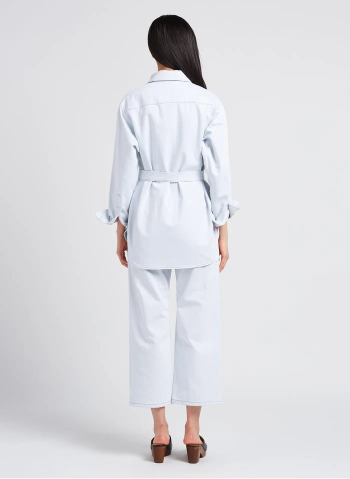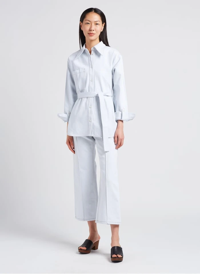 This model is shown wearing Classic denim overshirt by VALENTINE GAUTHIER, Wedge-heel leather mules by BOBBIES