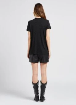This model is shown wearing Straight leather shorts by IKKS, Two-tone leather cowboy boots by IKKS
