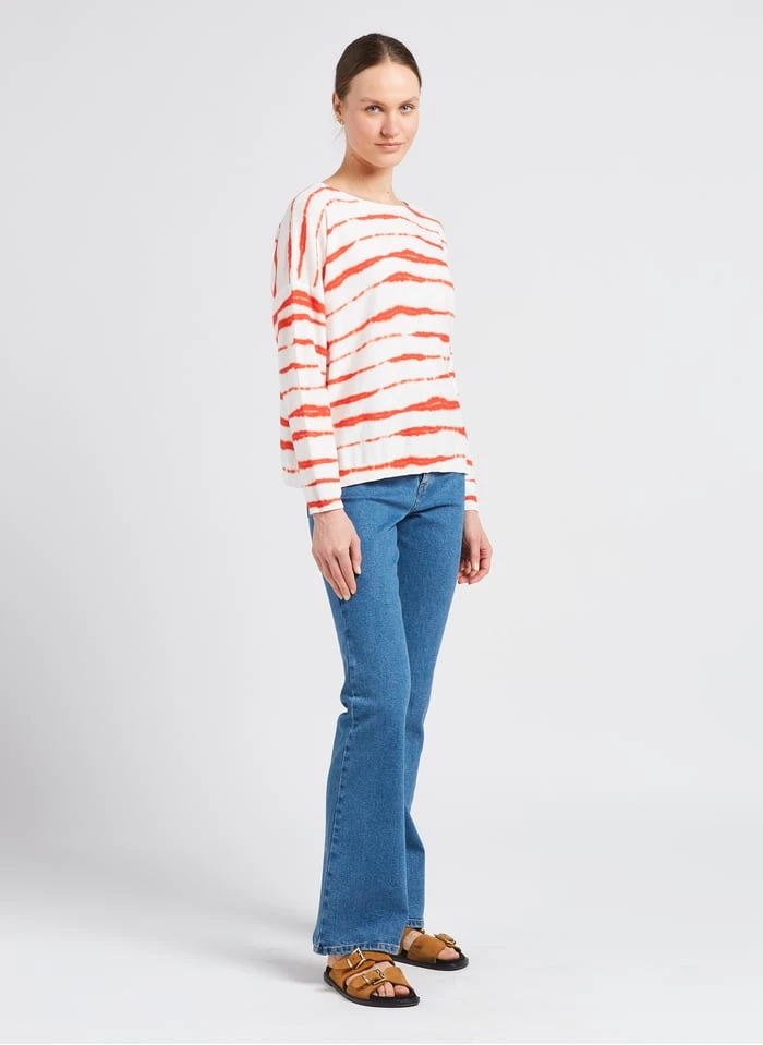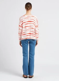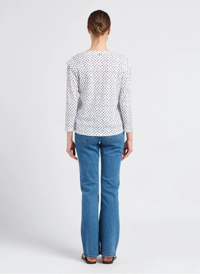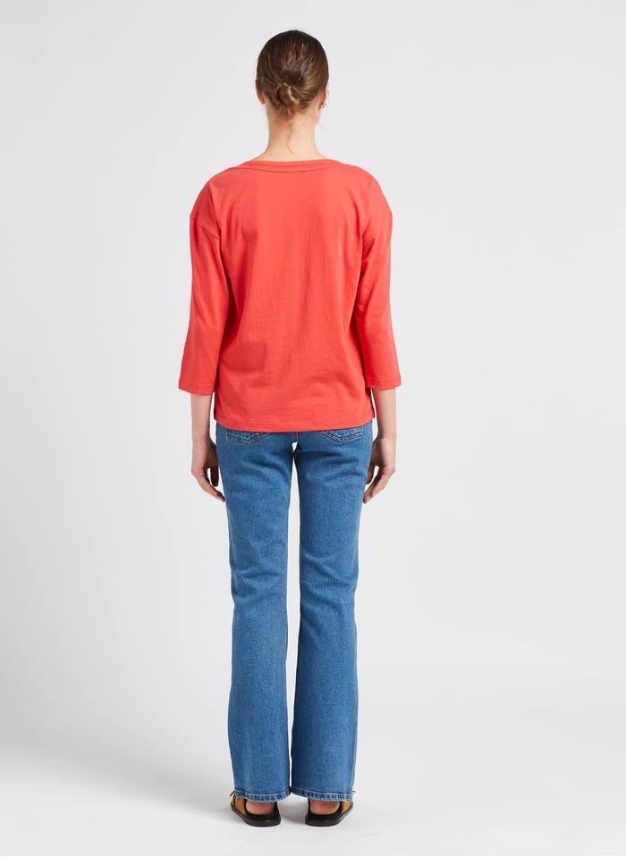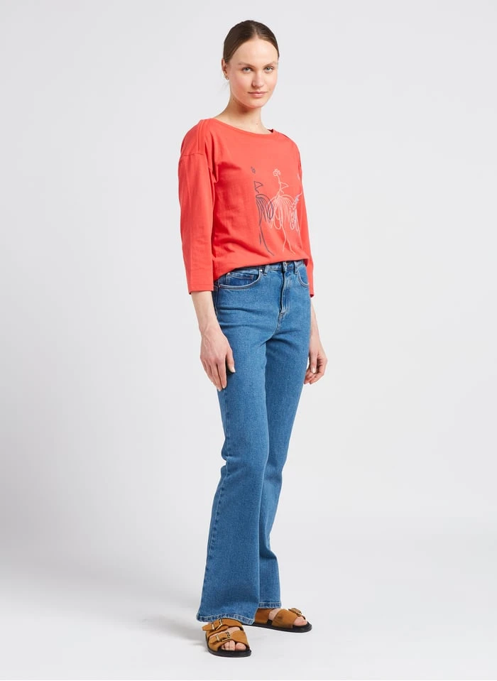 This model is shown wearing Boat-neck T-shirt with screen print by ONE STEP