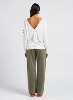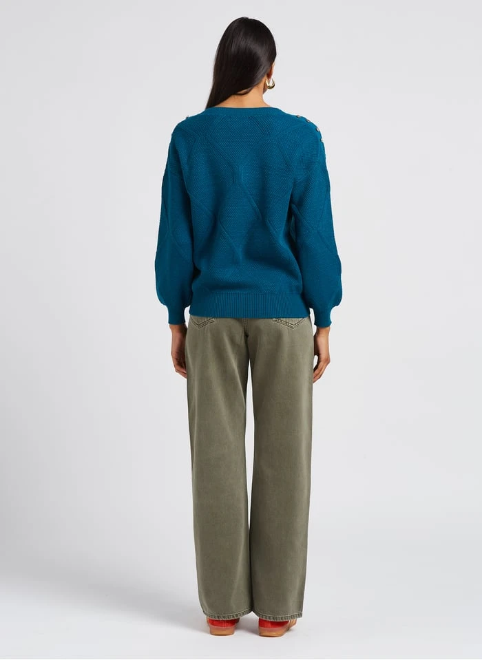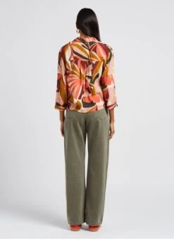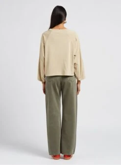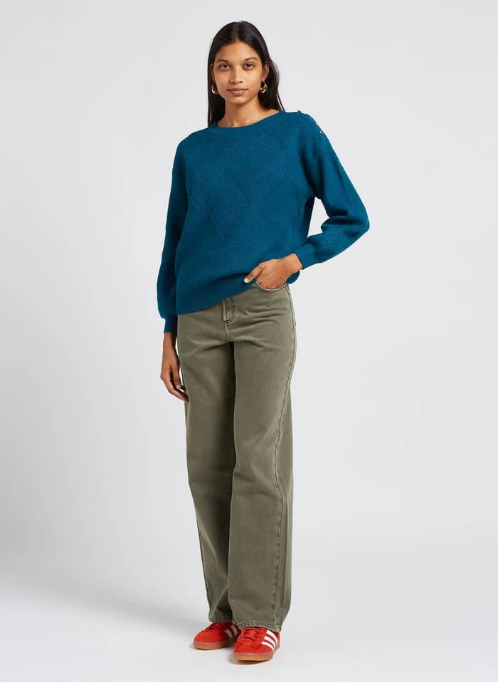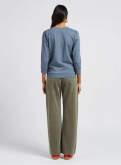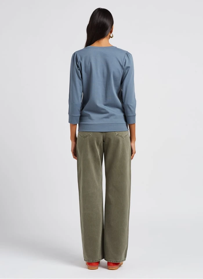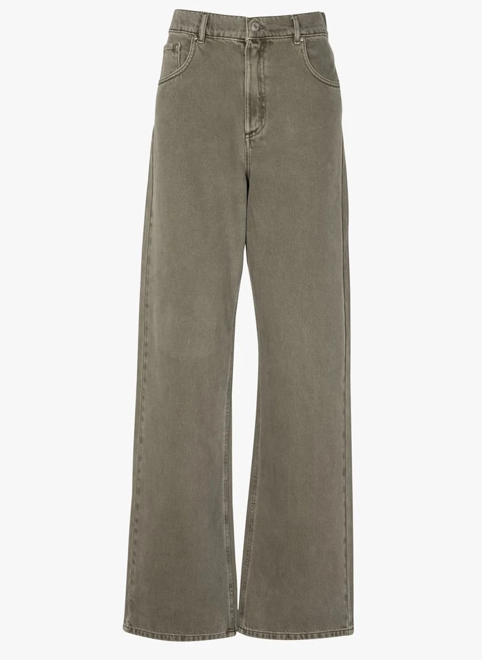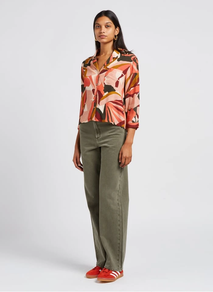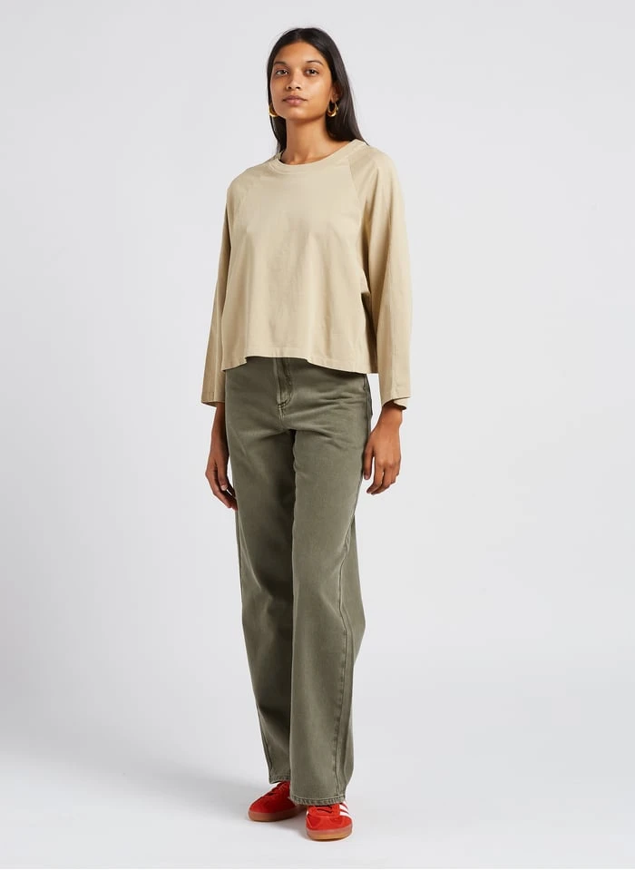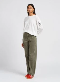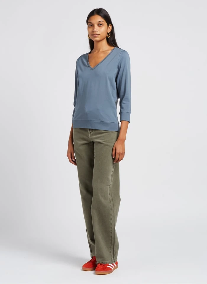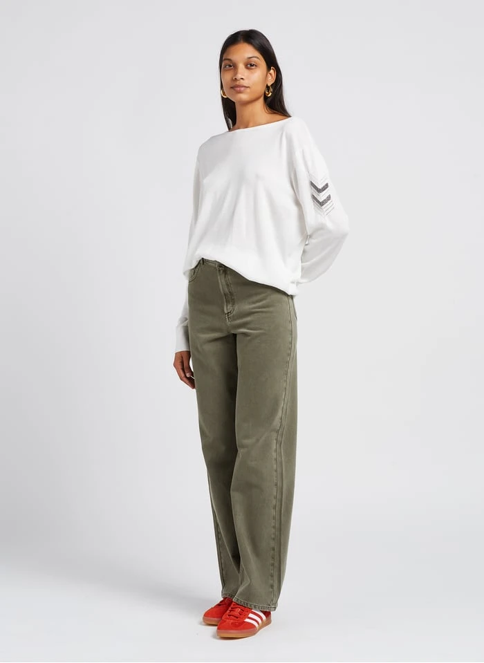 This model is shown wearing Round-neck cotton T-shirt by AMERICAN VINTAGE, Leather low-top sneakers by ADIDAS