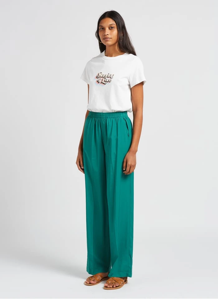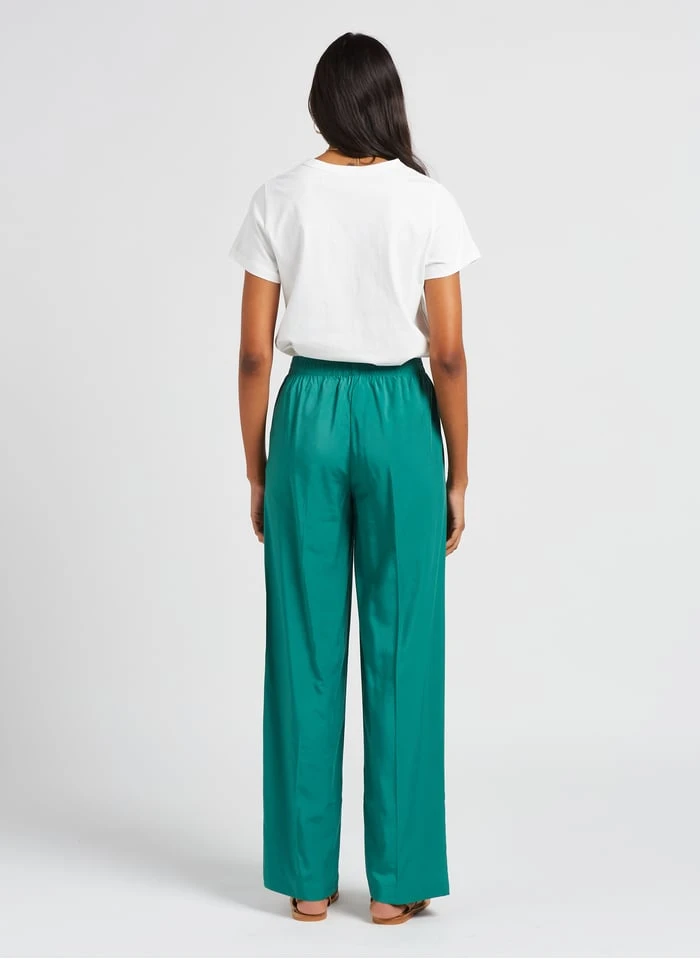 This model is shown wearing Straight-leg fluid high-waisted pants by GRACE ET MILA, Smooth leather loafers by MAISON 123