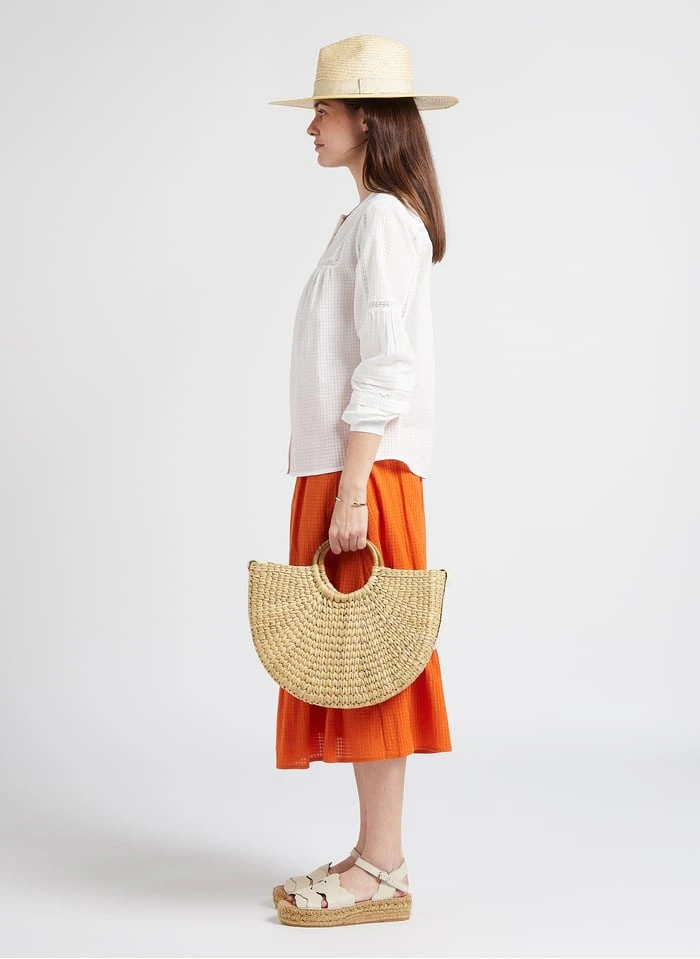 This model is shown wearing Straw basket by FEEKA, Straw hat by MARADJI, Round-neck organic cotton top by EKYOG, Leather wedge espadrilles by NAGUISA