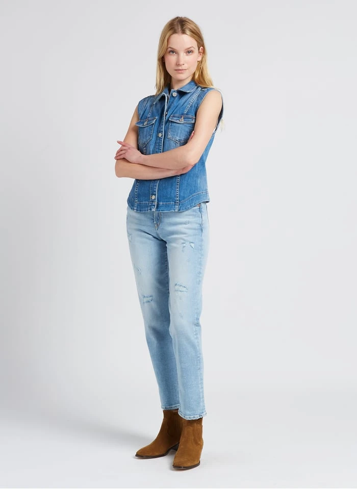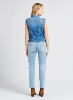 This model is shown wearing Sleeveless cotton-blend denim jacket by LE TEMPS DES CERISES