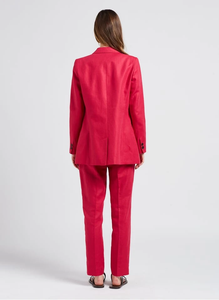 This model is shown wearing Leopard print wool-blend dress by WHISTLES, Bell-bottom pants by VILA, Linen-blend tailored chinos by MAISON 123, Linen-blend blazer by MAISON 123, Textured striped bucket hat by BECKSONDERGAARD, Heeled leather mules by CAMPER, Flat leather mules by SOEUR