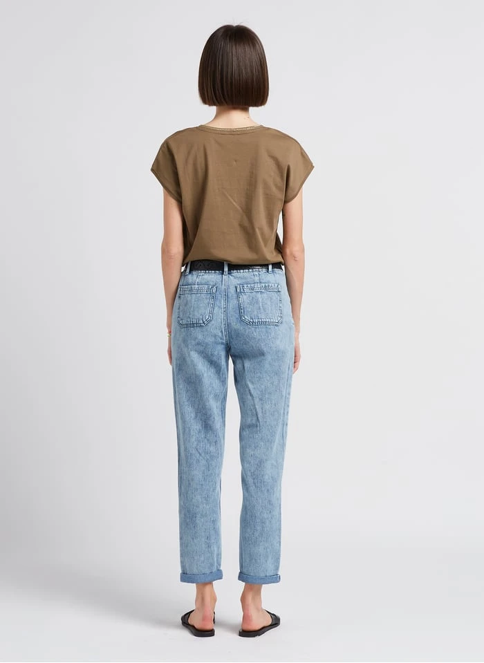This model is shown wearing Straight-leg jeans by MAISON 123, Flat satin mules by ANCIENT GREEK SANDALS, Perforated leather belt by LA FEE MARABOUTEE