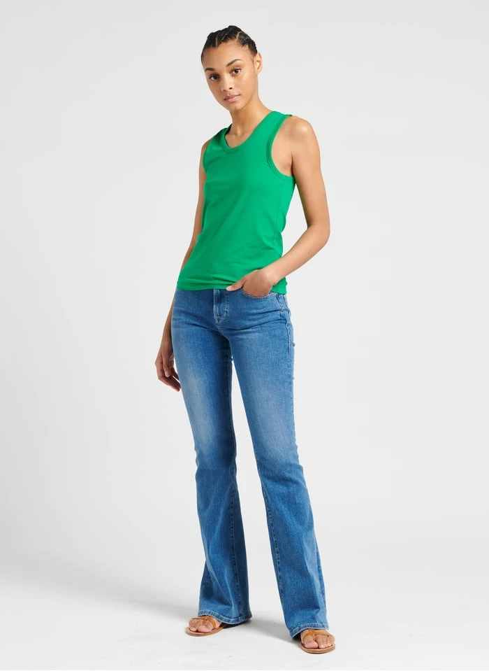 This model is shown wearing High-rise flared jeans by FRAME