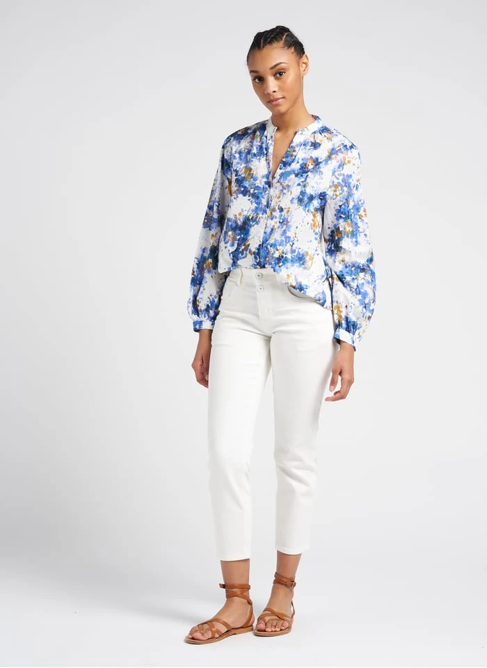 This model is shown wearing Printed cotton V-neck blouse by MARC O’POLO, Laminated leather sandals by JONAK