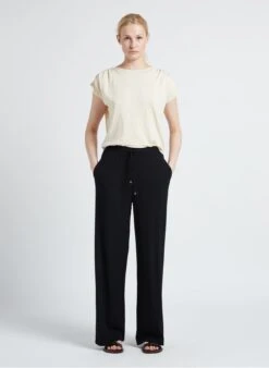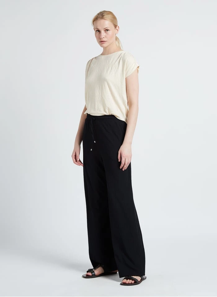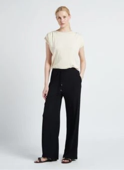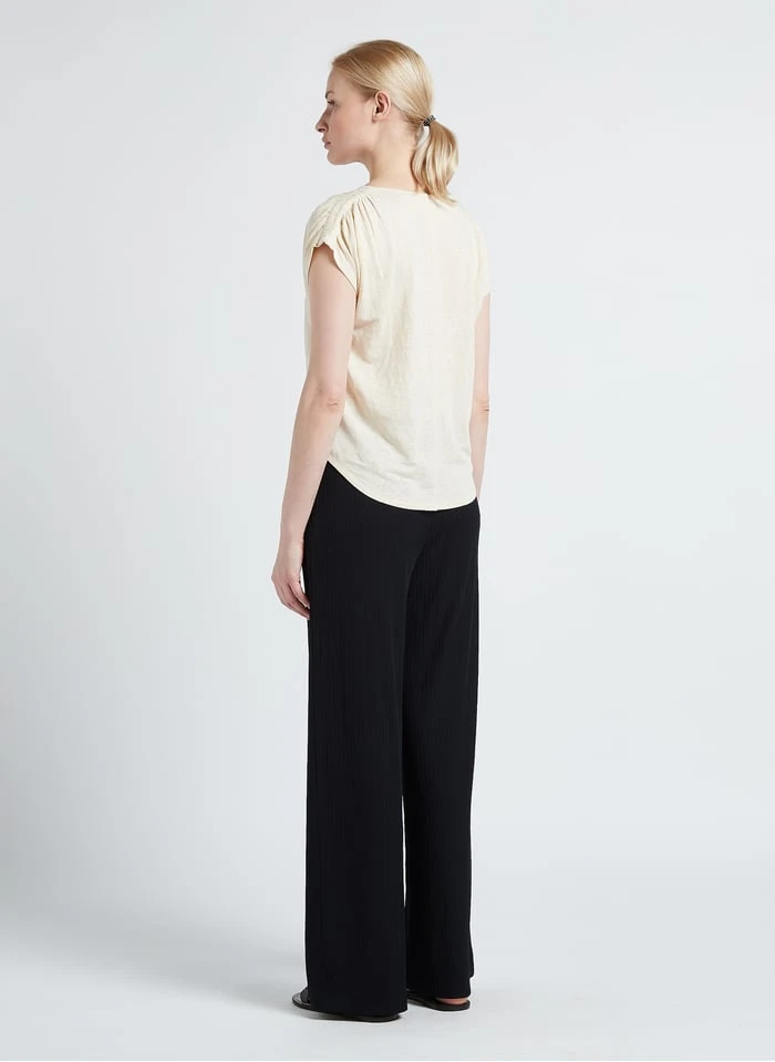 This model is shown wearing Round-neck linen-blend T-shirt by MAX MARA LEISURE