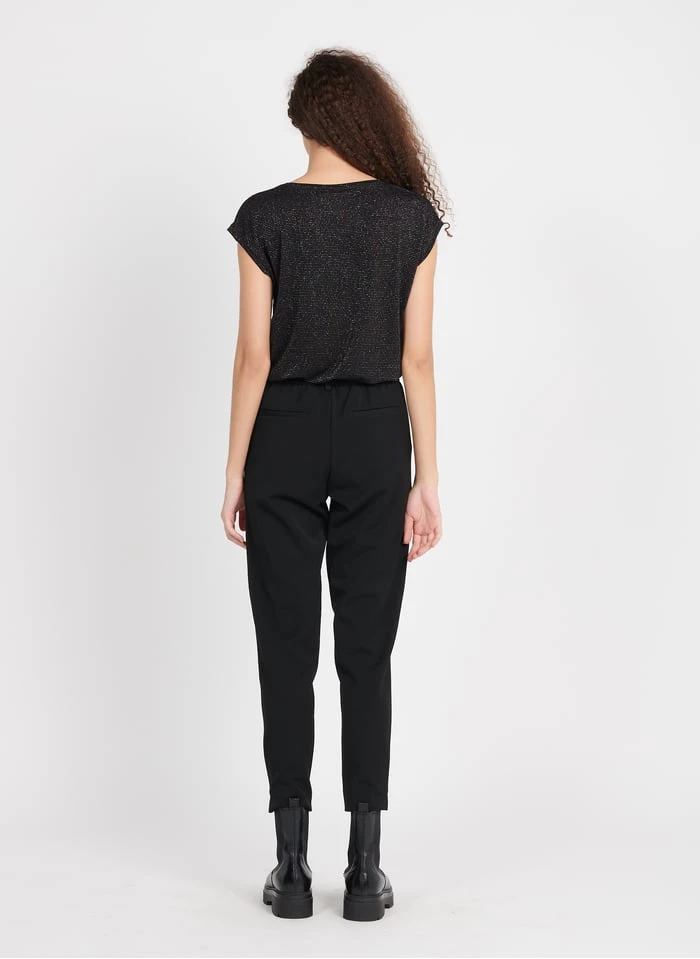 This model is shown wearing Metallic striped round-neck T-shirt by PIECES