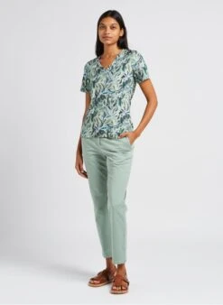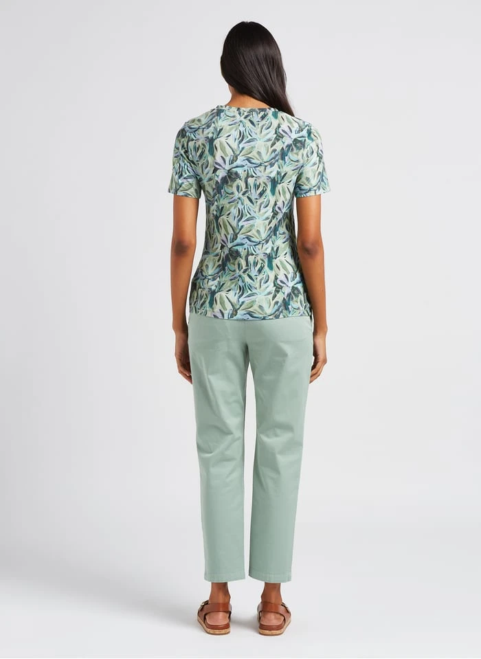 This model is shown wearing Straight organic cotton 7/8 pants by PAUL SMITH, Smooth leather flat sandals by CHIE MIHARA