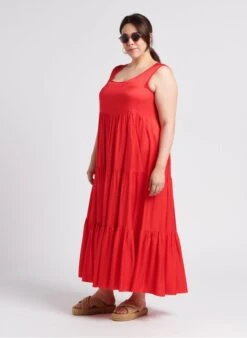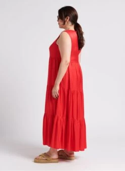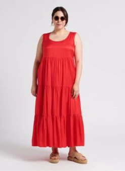 Long flared V-neck dress with ruffles by Persona for Women.