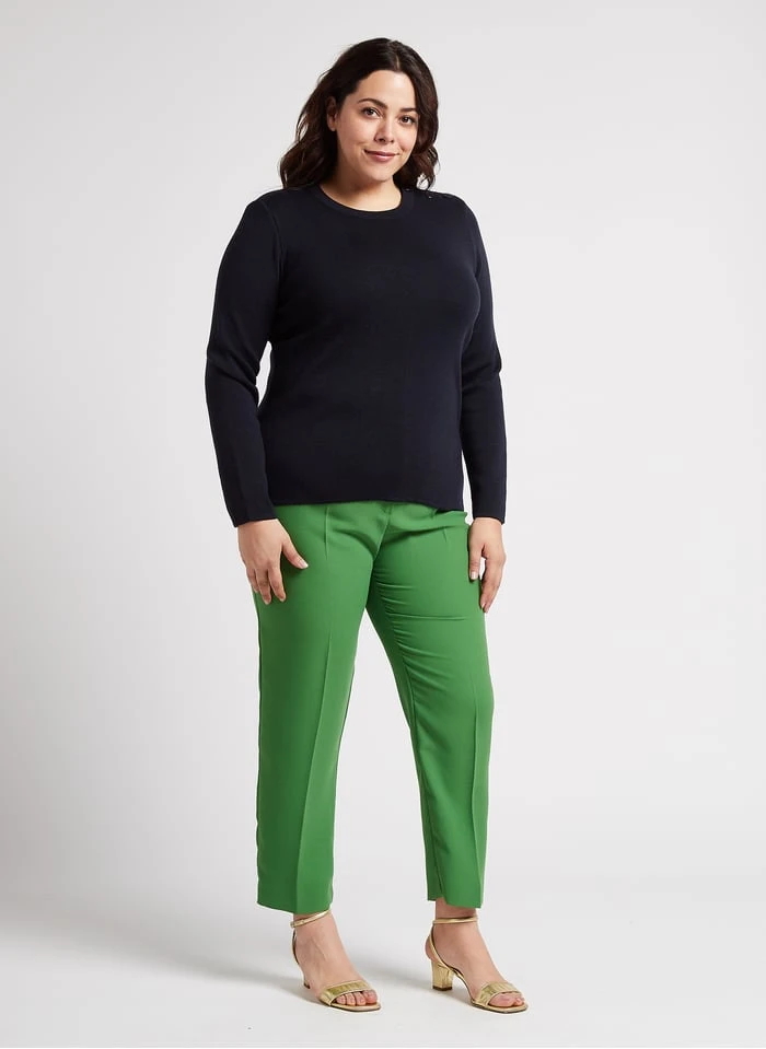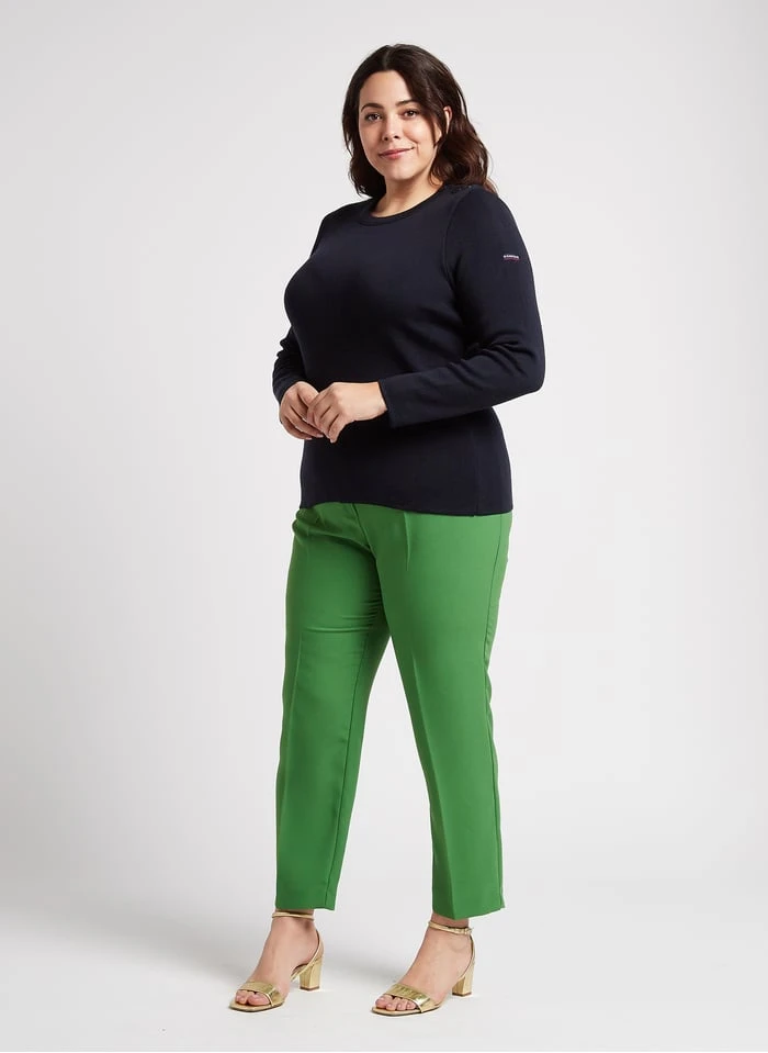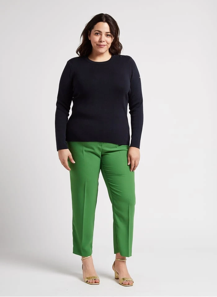 This model is shown wearing Round-neck wool sweater by ARMOR LUX