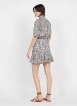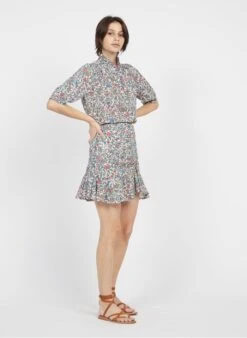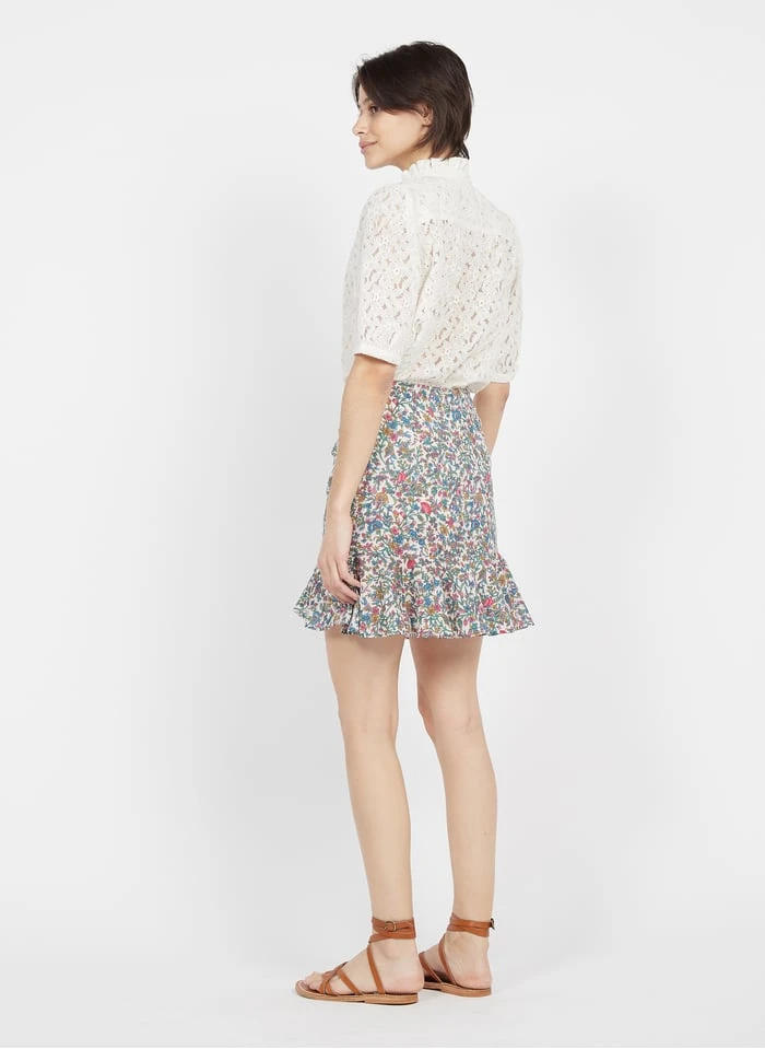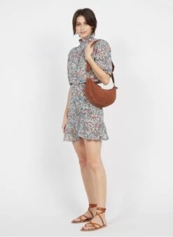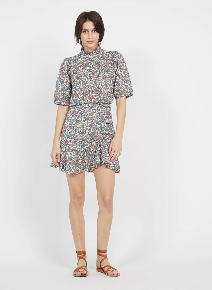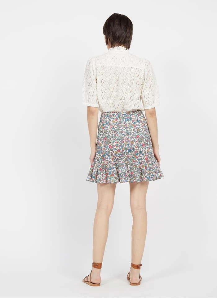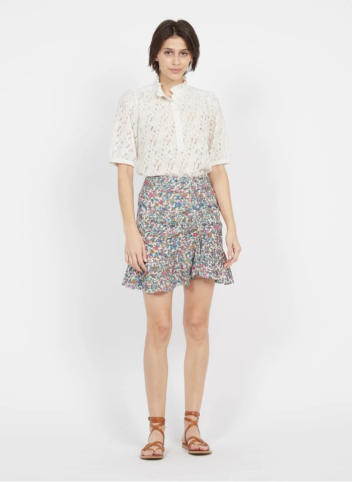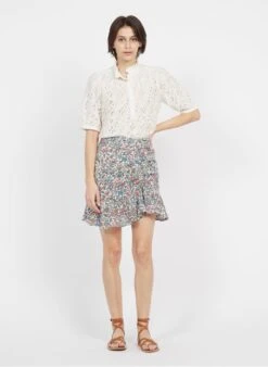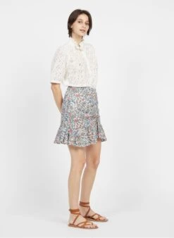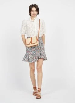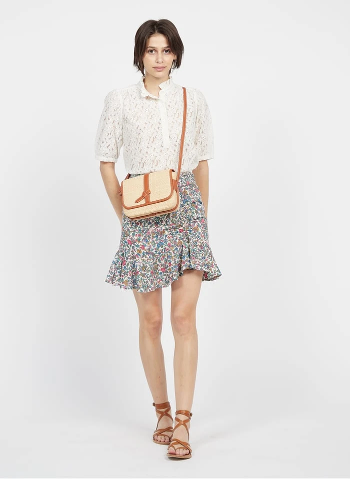 This model is shown wearing Raffia shoulder bag by PETITE MENDIGOTE, Straight lace shirt by PETITE MENDIGOTE