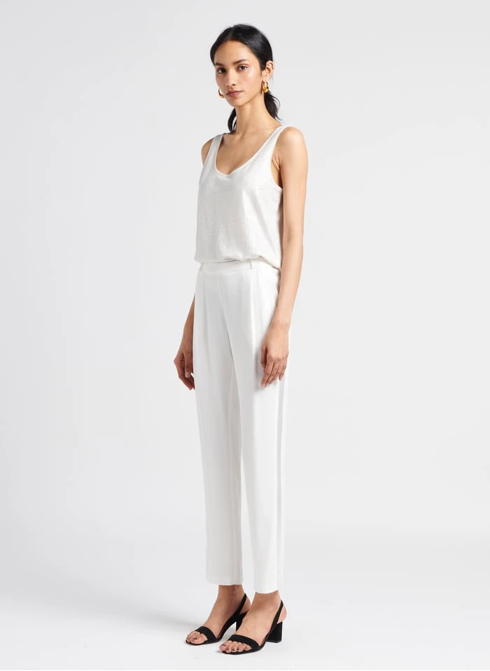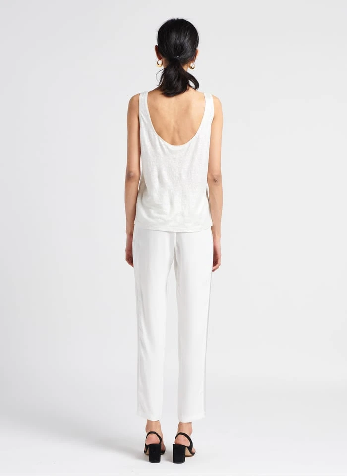 This model is shown wearing Round-neck linen tank top by MARIE SIXTINE, Suede sandals by JONAK