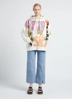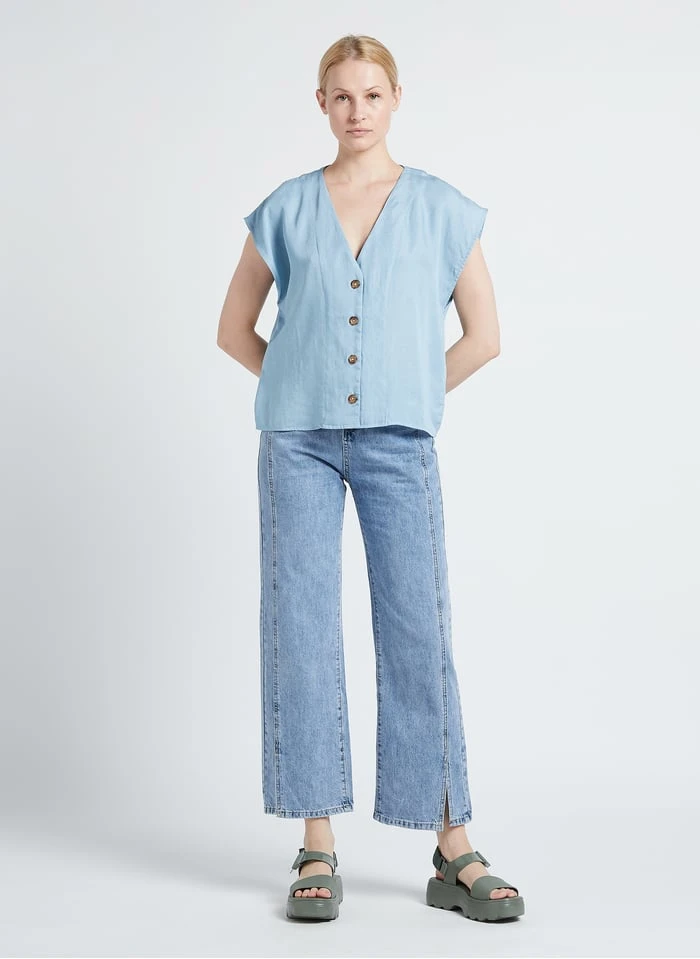 This model is shown wearing V-neck top by RITA ROW, Platform sandals by MELISSA