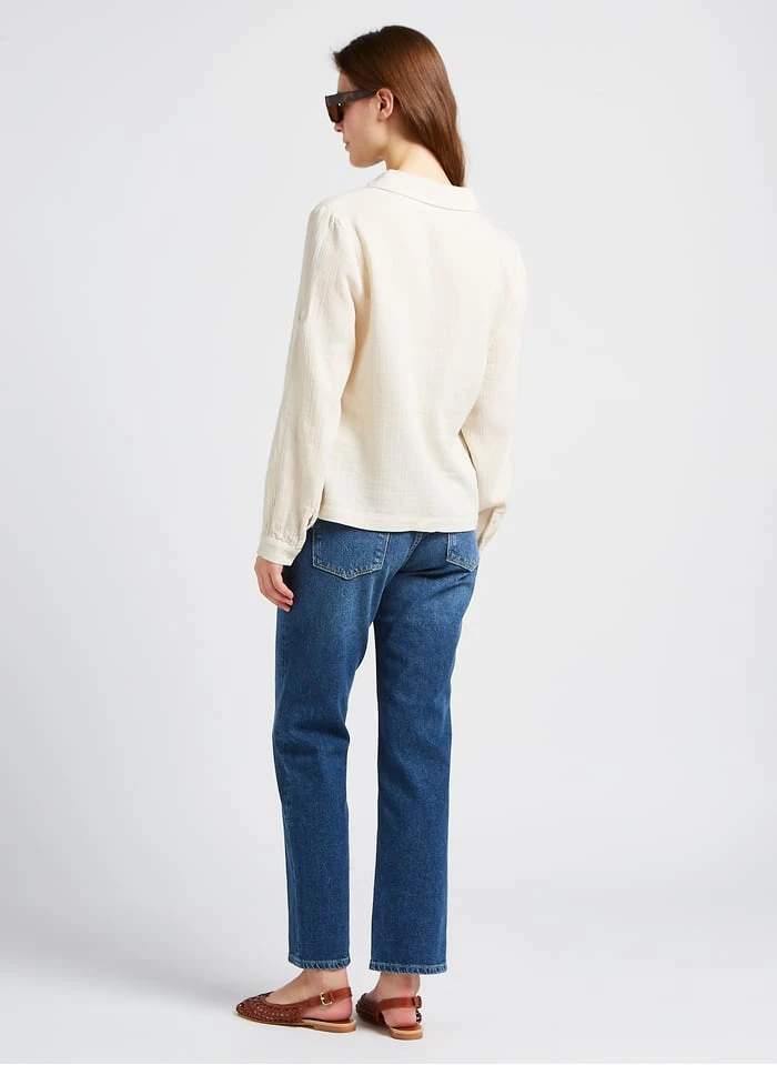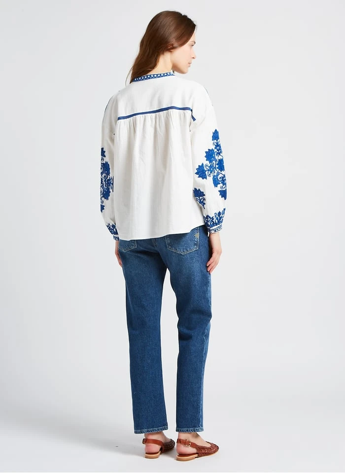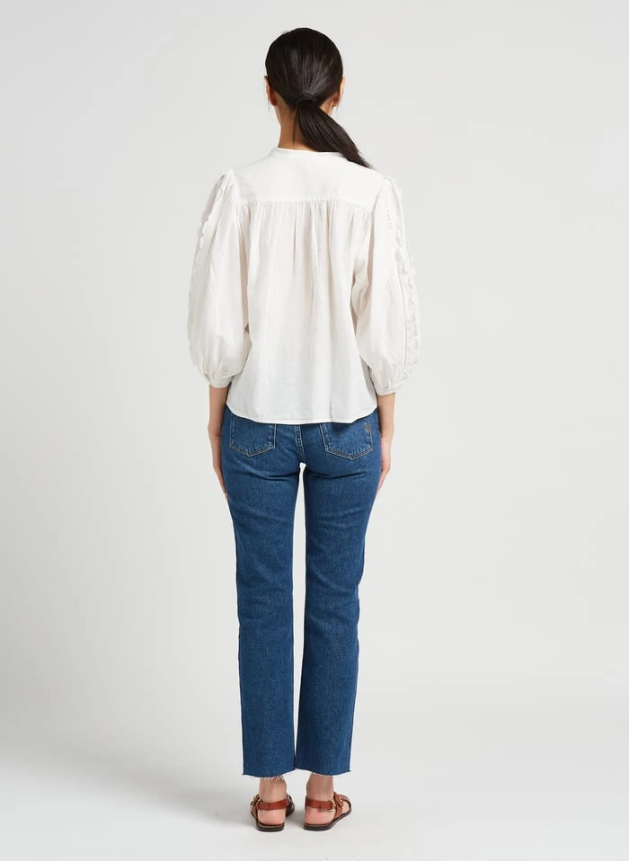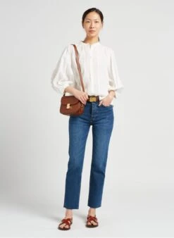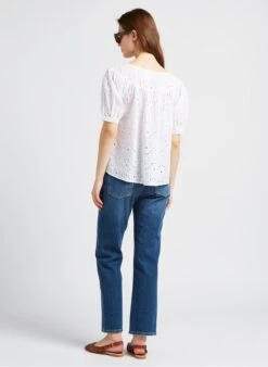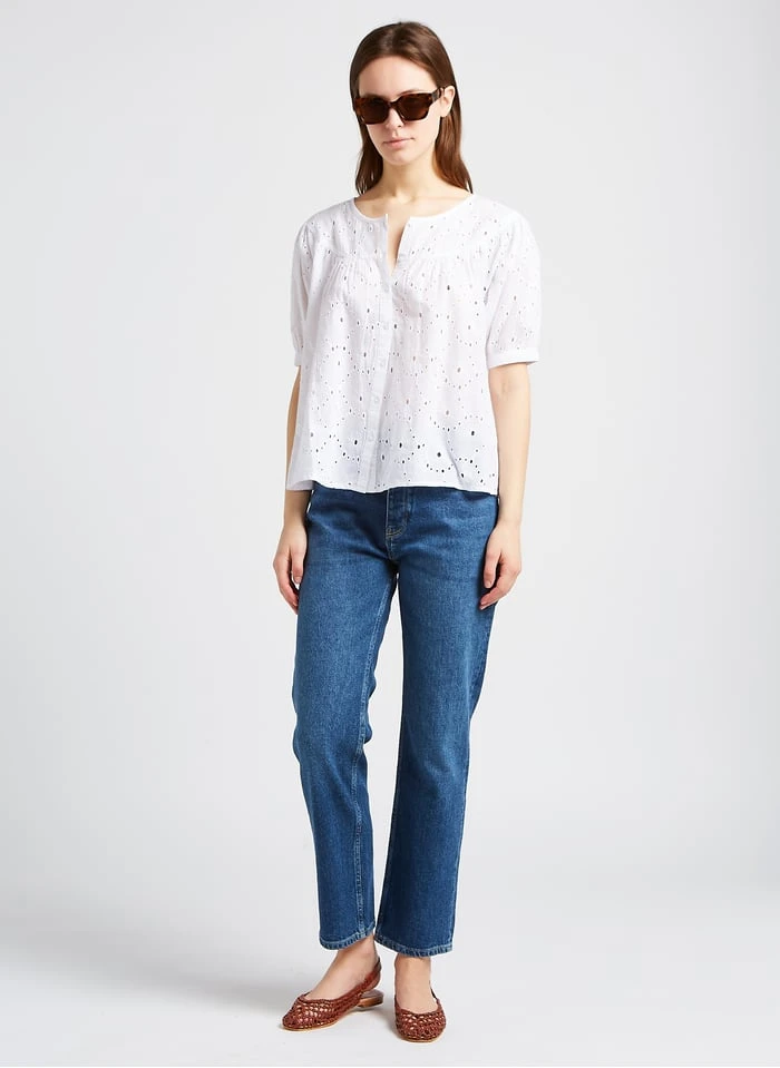 This model is shown wearing Round-neck embroidered cotton blouse by PABLO, Flat leather sandals with buckle by BOSABO, Glazed leather belt by SOEUR