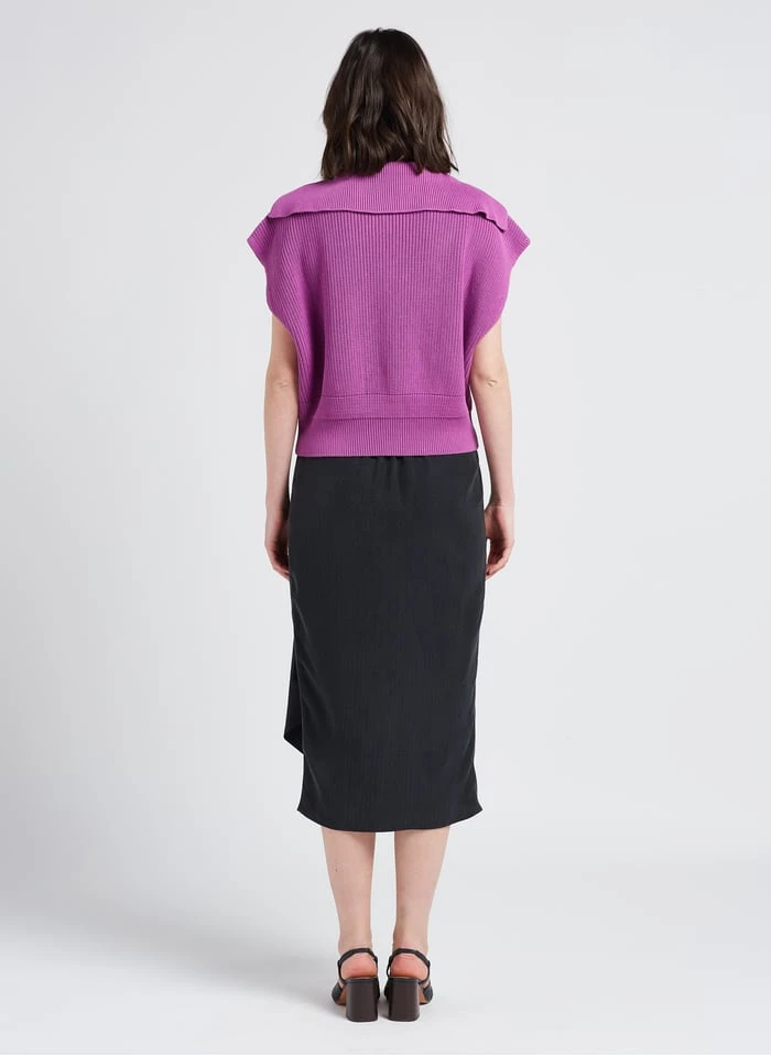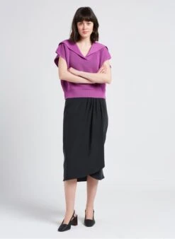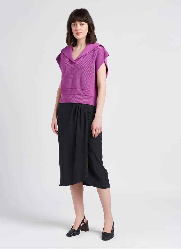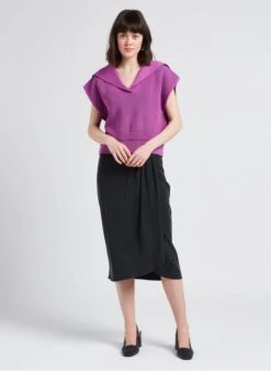 This model is shown wearing Loose-fit pea-jacket collar cotton sweater by SESSUN