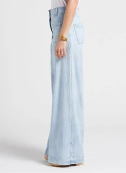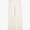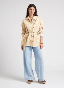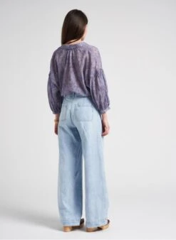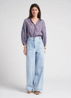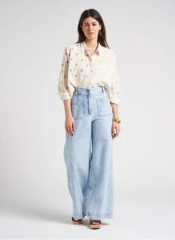 This model is shown wearing Printed cotton-blend shirt with classic collar by SESSUN, Wedge-heel leather sandals by SESSUN