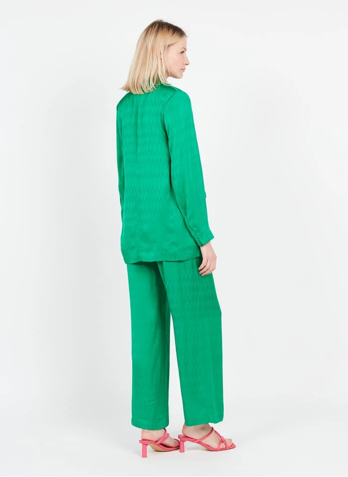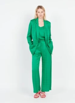 This model is shown wearing Flowing V-neck camisole by SUNCOO, Leather sandals by SUNCOO, Suit jacket by SUNCOO