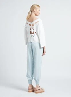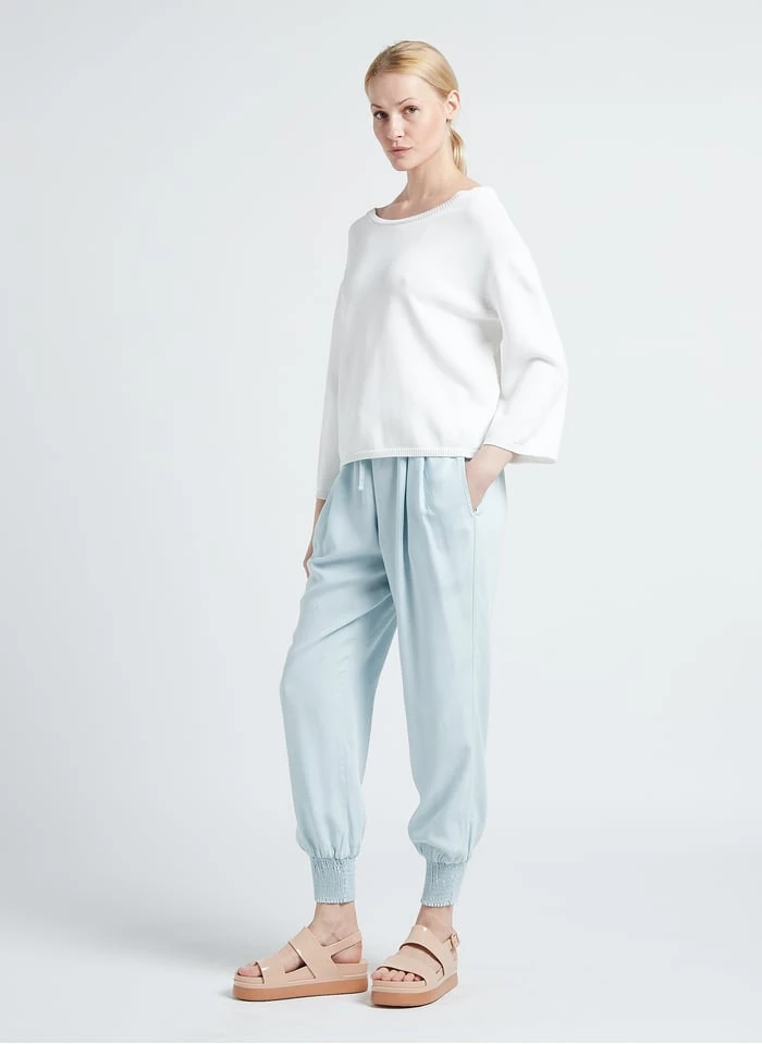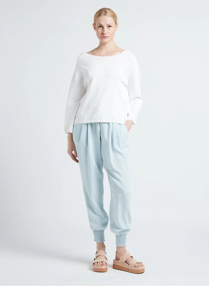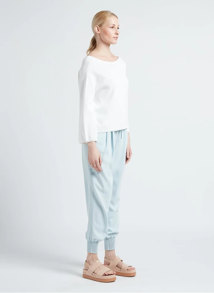 This model is shown wearing Openwork mixed-knit boat-neck sweater by TWINSET, Platform sandals by MELISSA