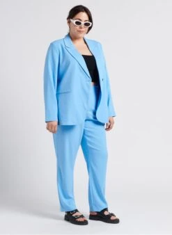 This model is shown wearing Ribbed viscose stretchy crop top by MAT FASHION, Slim-fit tailored jacket by VERO MODA CURVE, Flat leather sandals by MELLOW YELLOW